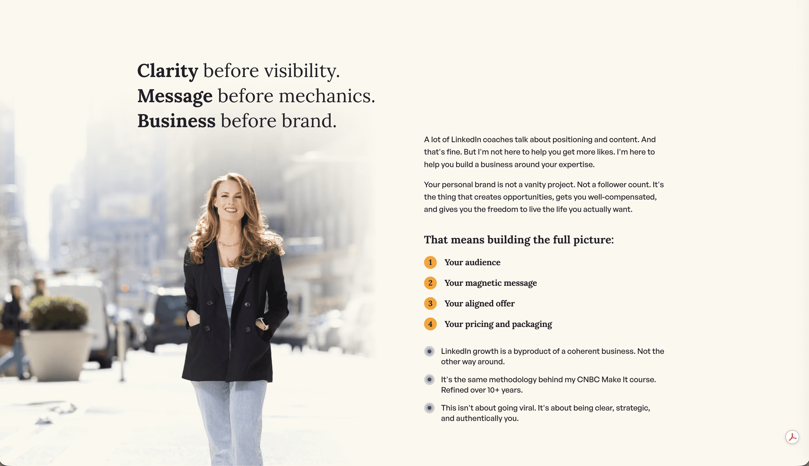 A clean, editorial layout designed to feel structured, confident, and established. The page translates a long-form narrative into a cohesive visual flow, guiding the reader through her story, proof, and offers without losing momentum. Careful attention was given to hierarchy and pacing, ensuring each section connects seamlessly while balancing personal storytelling with strategic authority.