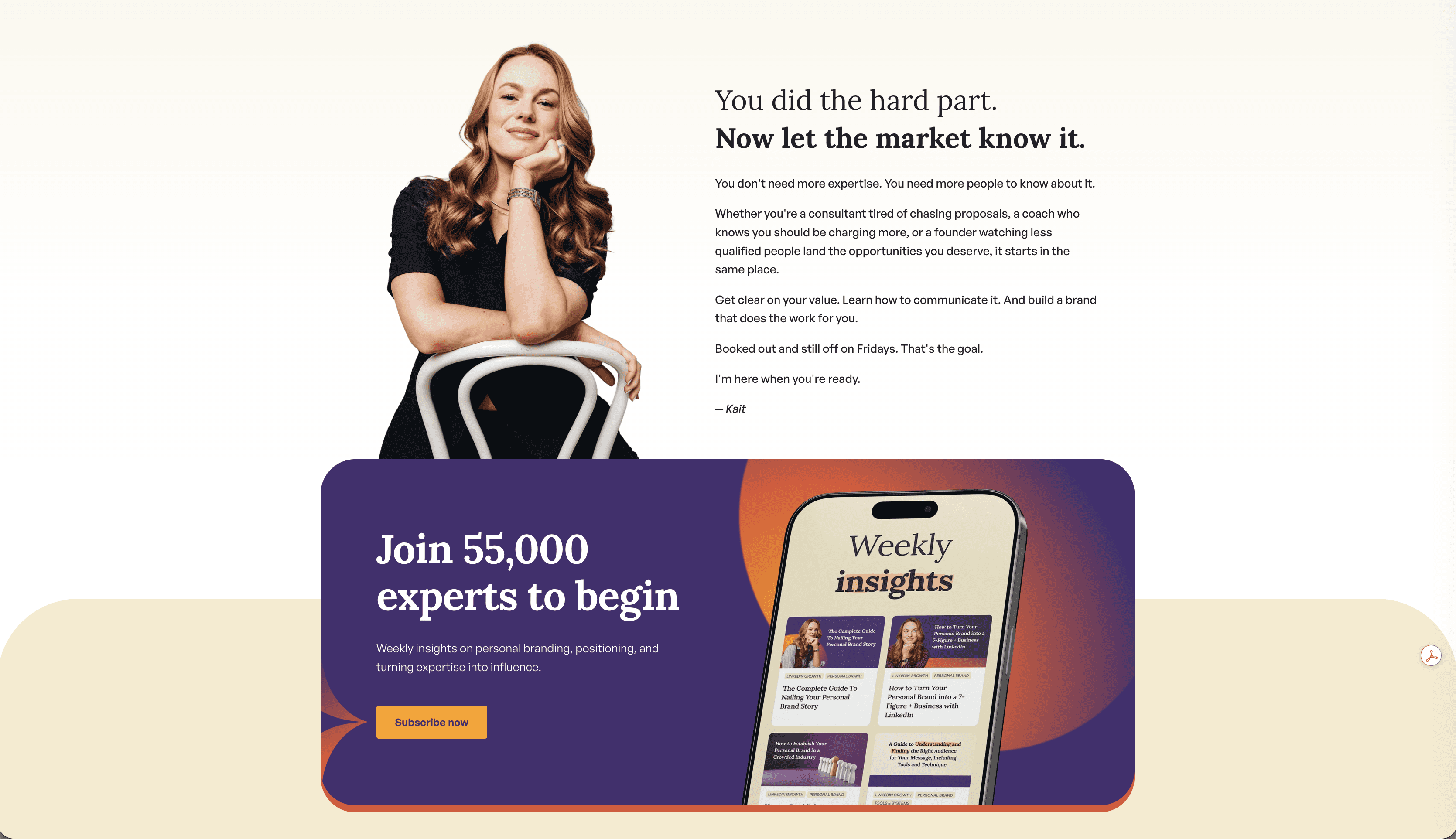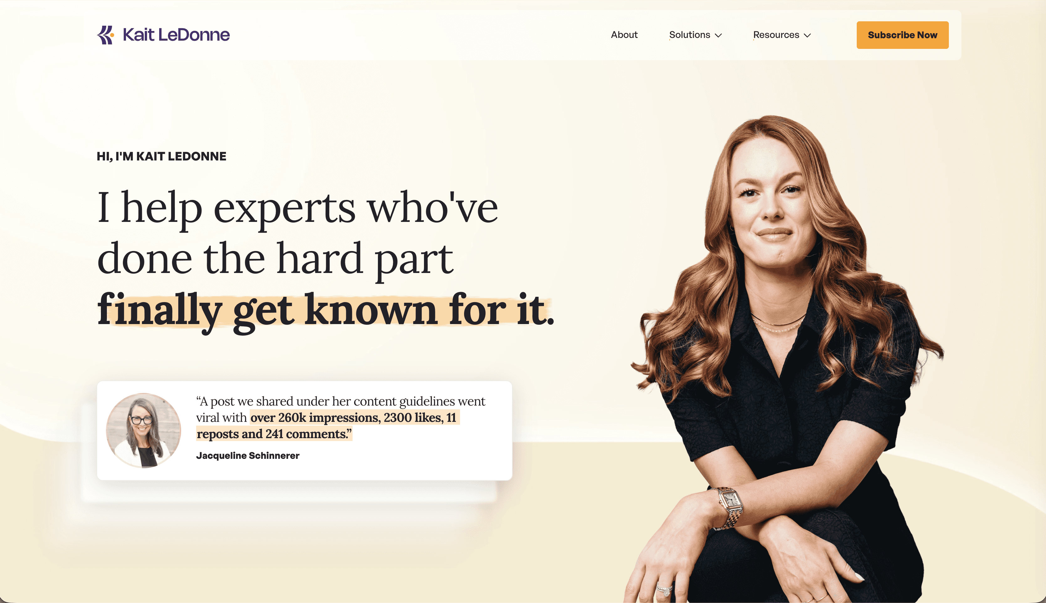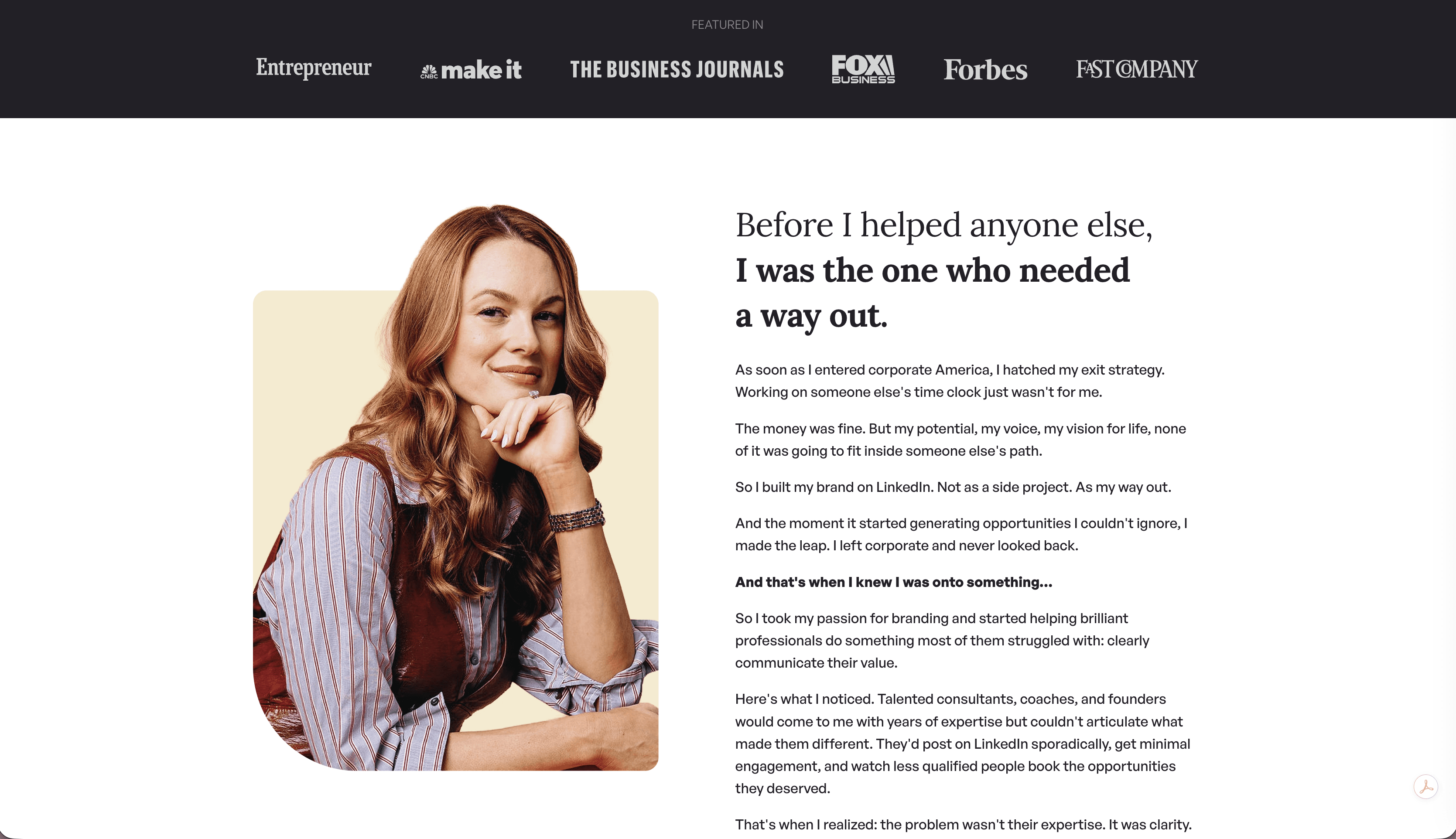 Design an About page for Kait LeDonne, a personal brand strategy and LinkedIn growth expert, following her recent rebrand. The page needed to reflect her level of authority and experience, align with her new voice, and position her as a clear, premium leader in her space.