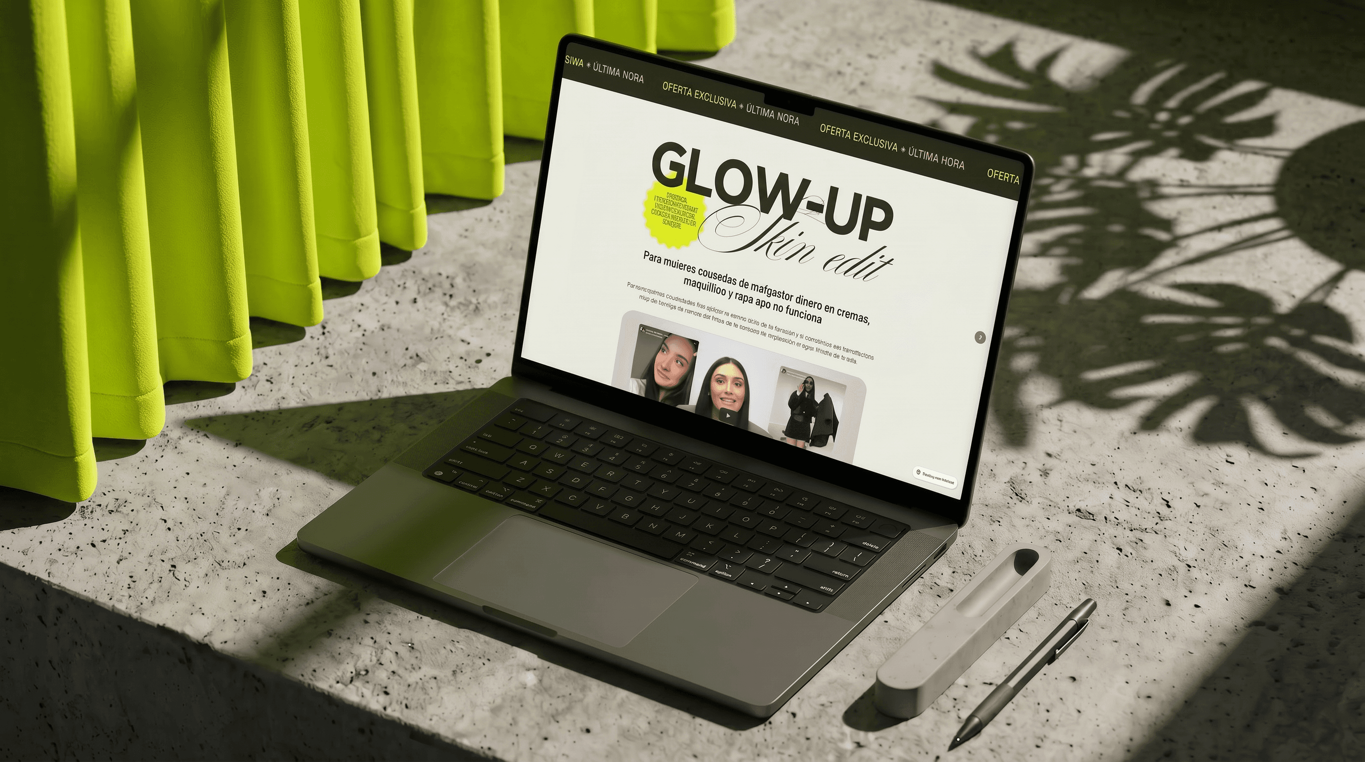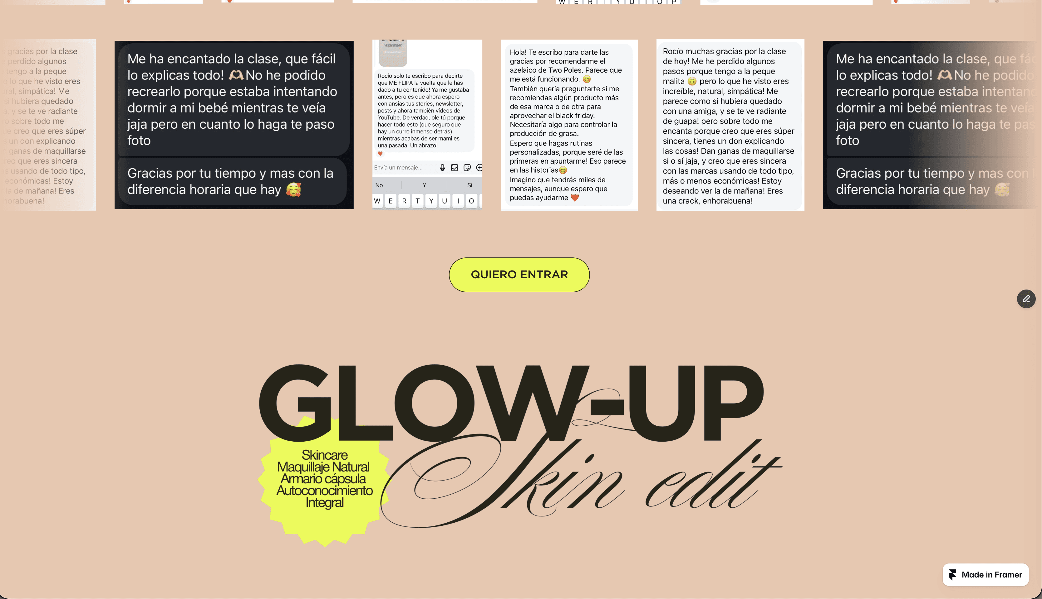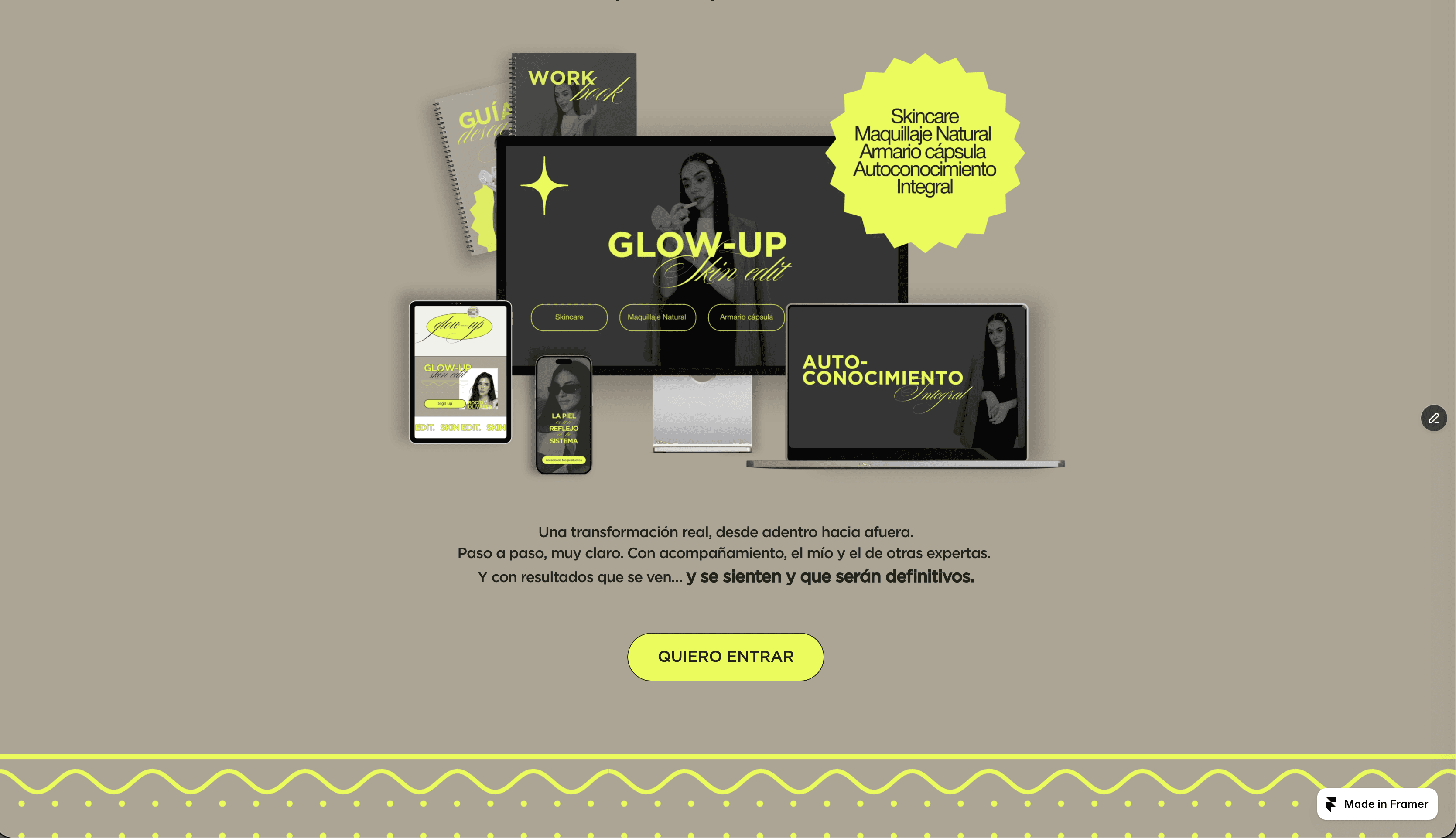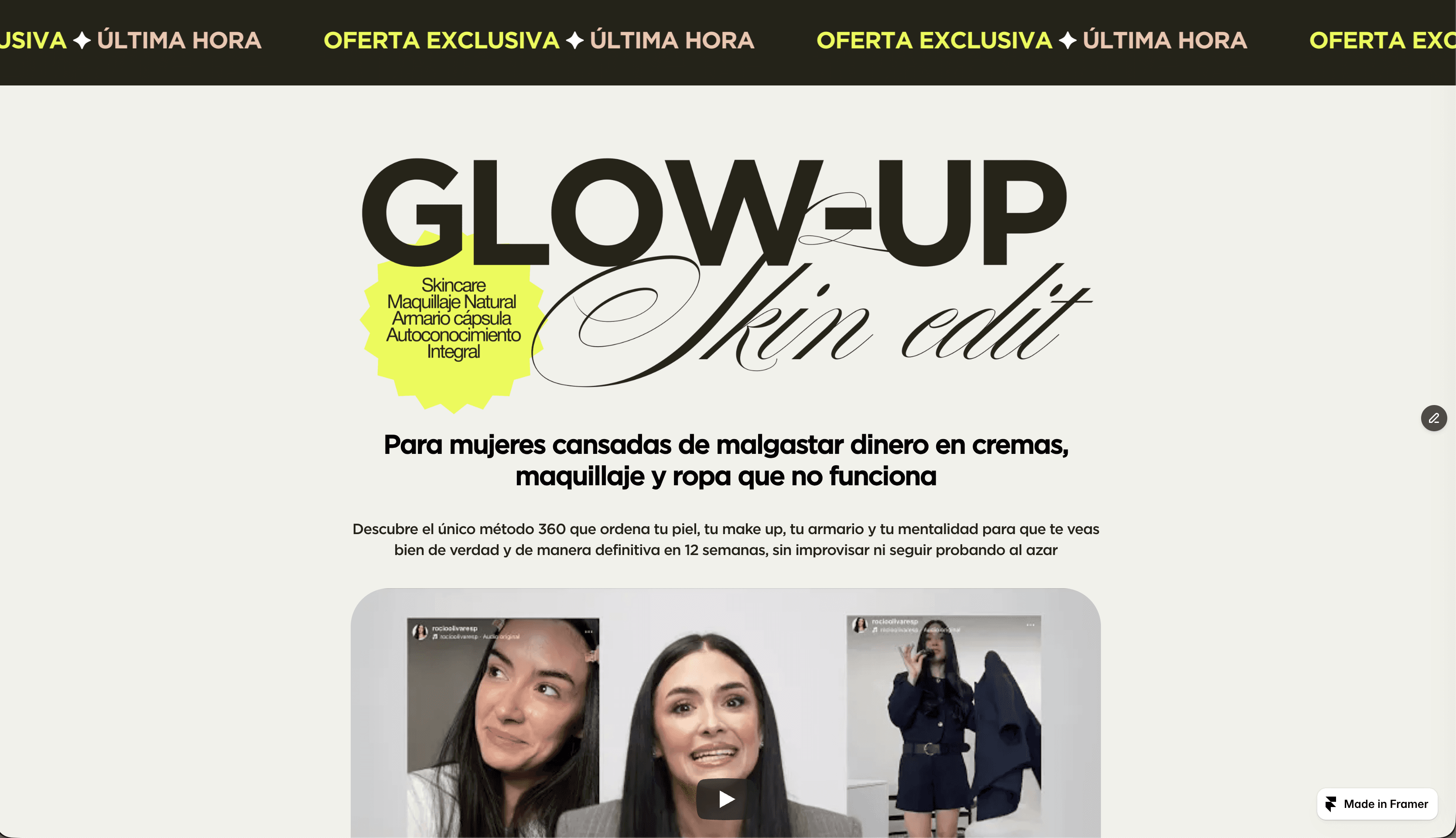 Design a cohesive brand and landing page for Glow-Up Skin Edit, a 12-week transformation program by Rocío Olivares. The goal was to create a clear, compelling identity and sales experience that communicates her 360 approach to skin, makeup, style, and mindset, while positioning the offer as structured, effective, and results-driven.
